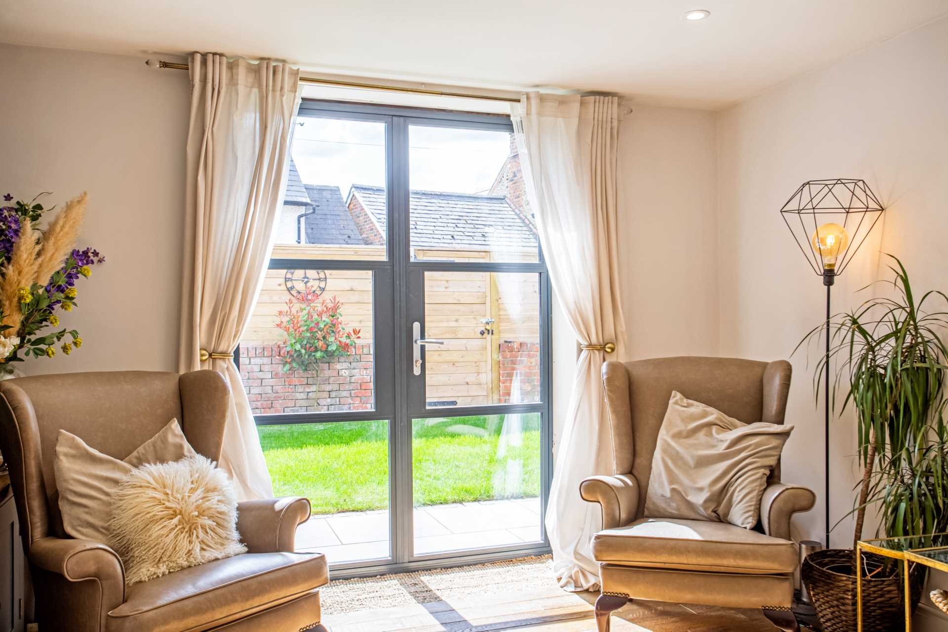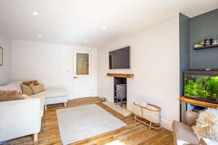 A light and airy reception room with modern glazed double doors opening to the rear garden, wood burning stove on a stone hearth with a wooden mantle, recessed ceiling down lights and radiator.